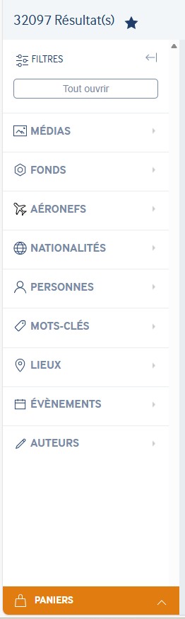 A partir des résultats d’une recherche, il est possible d’affiner la liste de résultats à l’aide des filtres se trouvant sur le côté gauche de la page (ce volet est déployable à volonté).
